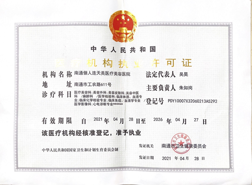 南通儷人連天美醫(yī)療美容醫(yī)院是與著名的醫(yī)療美容集團(tuán)合作建立的醫(yī)院,醫(yī)院提供高品質(zhì)的醫(yī)療美容服務(wù)。2008年,南通儷人連天美醫(yī)療美容醫(yī)院落戶南通,成為由南通衛(wèi)生局審批的專業(yè)醫(yī)療美容醫(yī)院。南通儷人連天美醫(yī)療美容醫(yī)院,特別設(shè)有專業(yè)的整形美容科、皮膚美容科和微創(chuàng)美容科三大科室,致力于為廣大求美者提供全方位的醫(yī)療美容服務(wù)。南通儷人連天美醫(yī)療美容醫(yī)院為求美者建立個(gè)人終生美麗檔案,一對(duì)一進(jìn)行細(xì)致服務(wù)。 11年來(lái),南通儷人連天美醫(yī)療美容醫(yī)院,不斷引進(jìn)先進(jìn)設(shè)備,不斷完善醫(yī)美技術(shù),一批優(yōu)秀、專業(yè)而穩(wěn)定的醫(yī)生團(tuán)隊(duì),為無(wú)數(shù)求美者鑄就美麗夢(mèng)想。